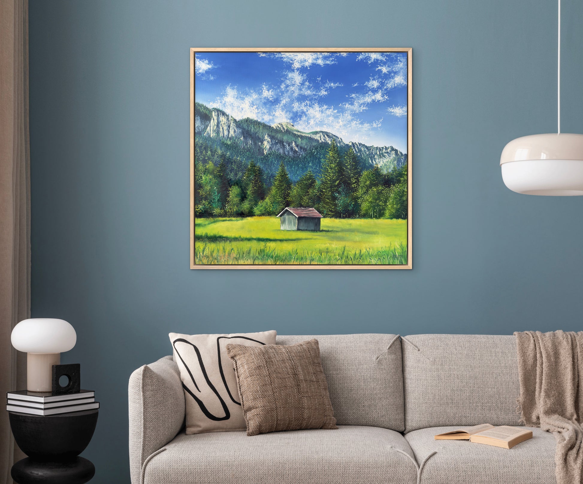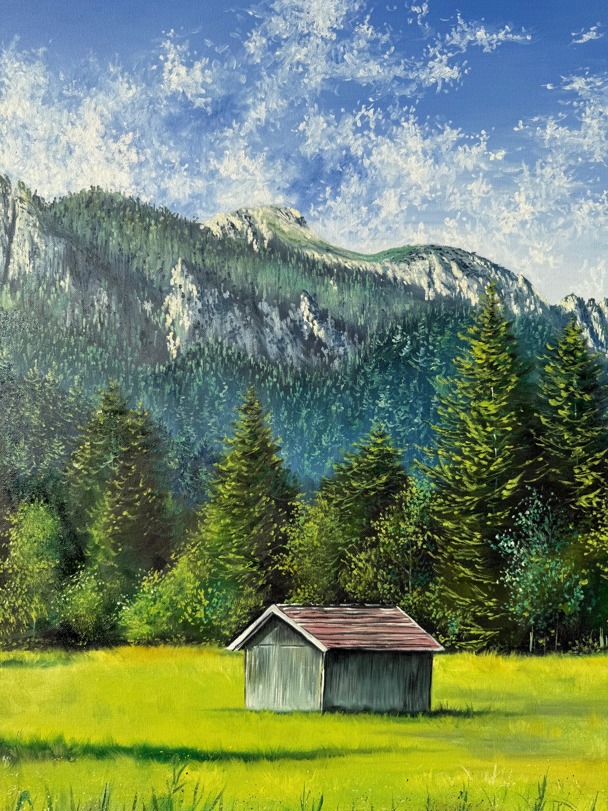 The painting shows a cabin in the German Alps, in Bavaria’s Allgäu.
