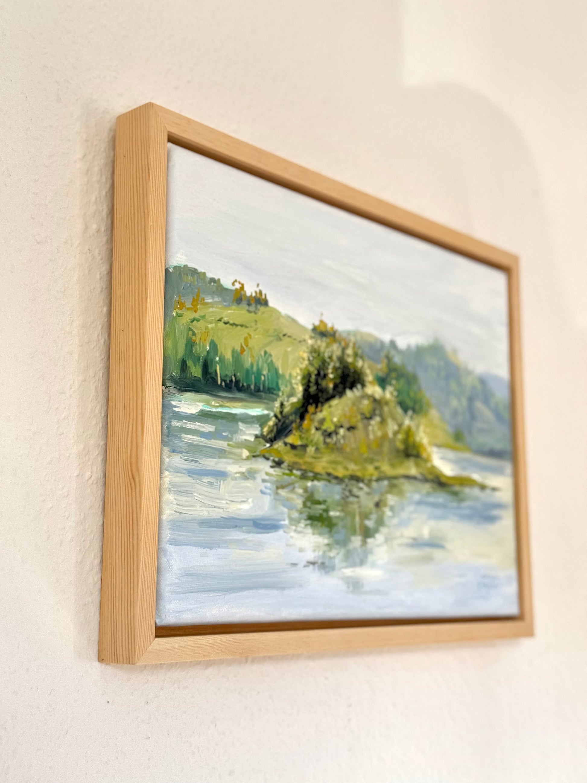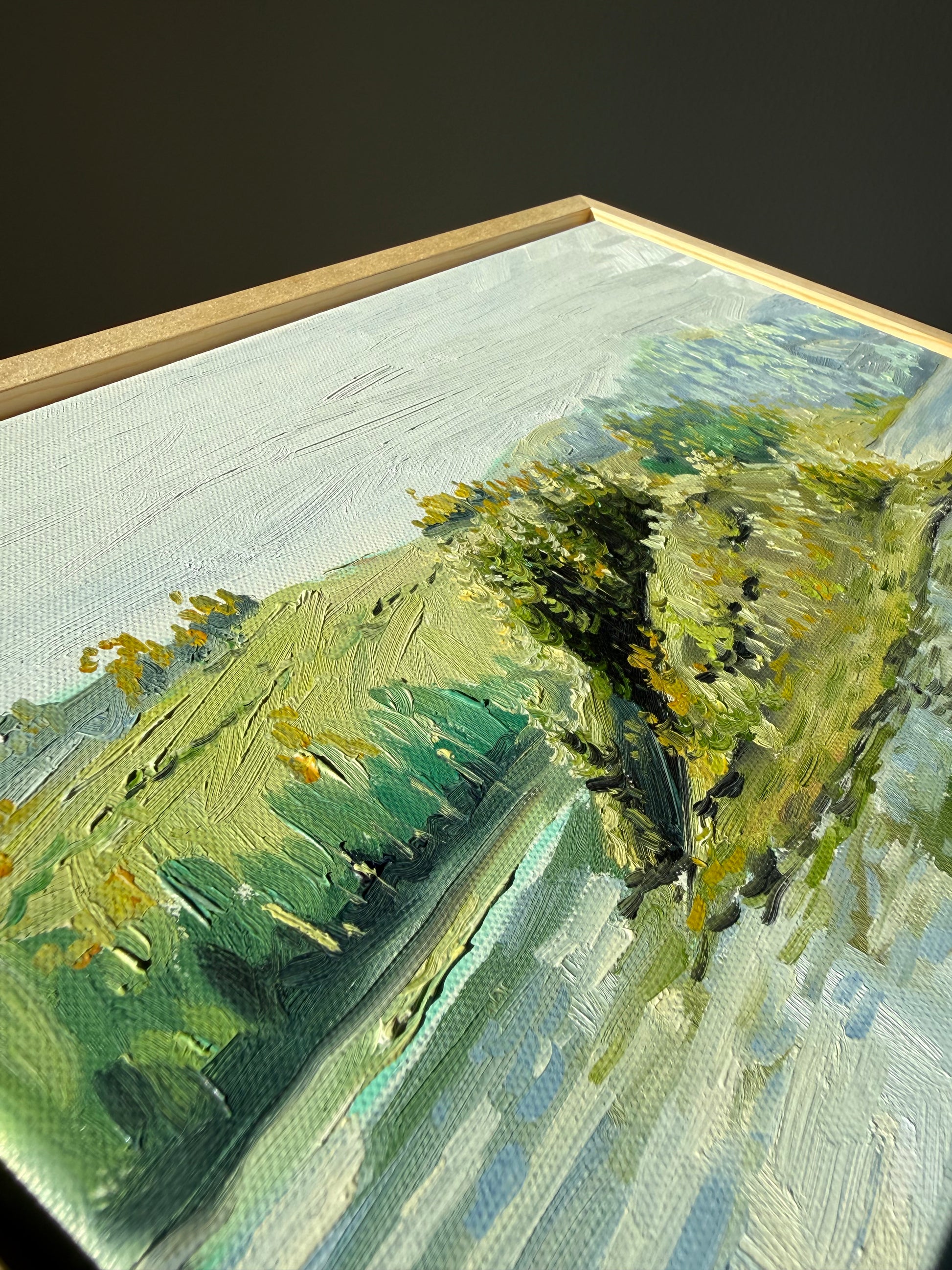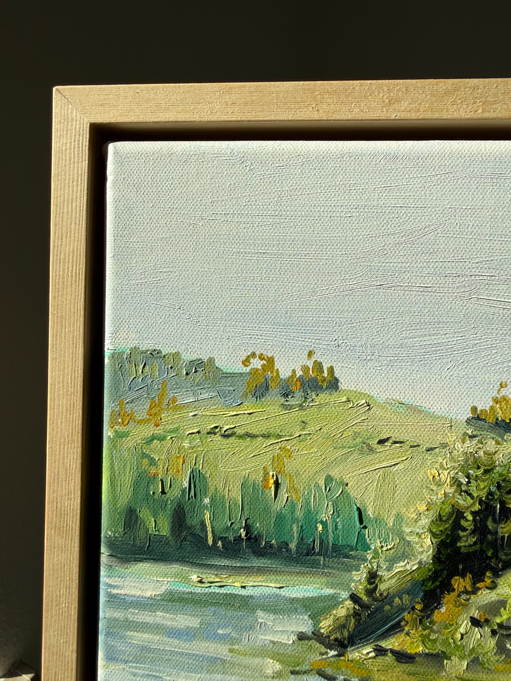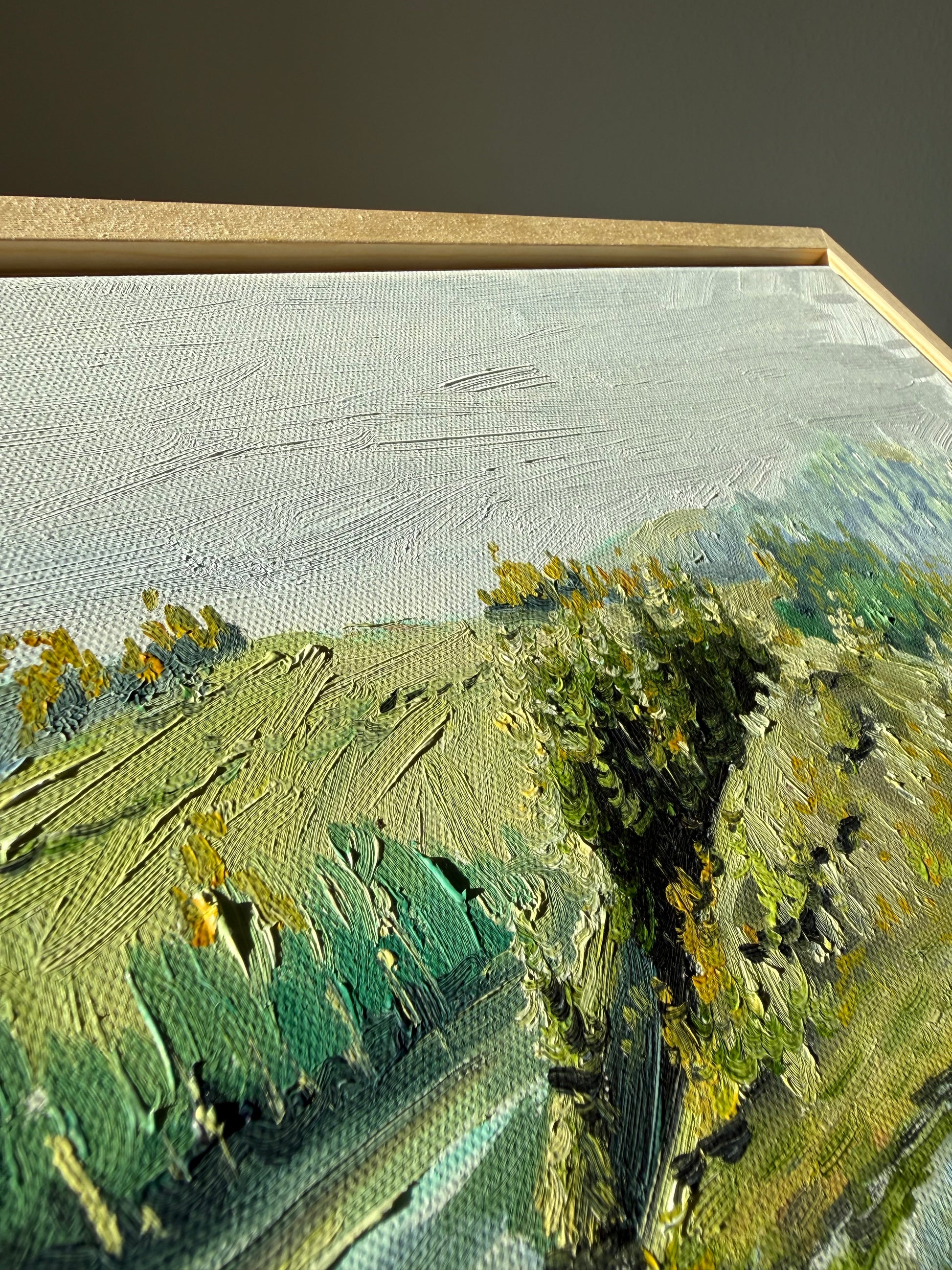 The painting is varnished, mounted in a floating frame and ready to hang.