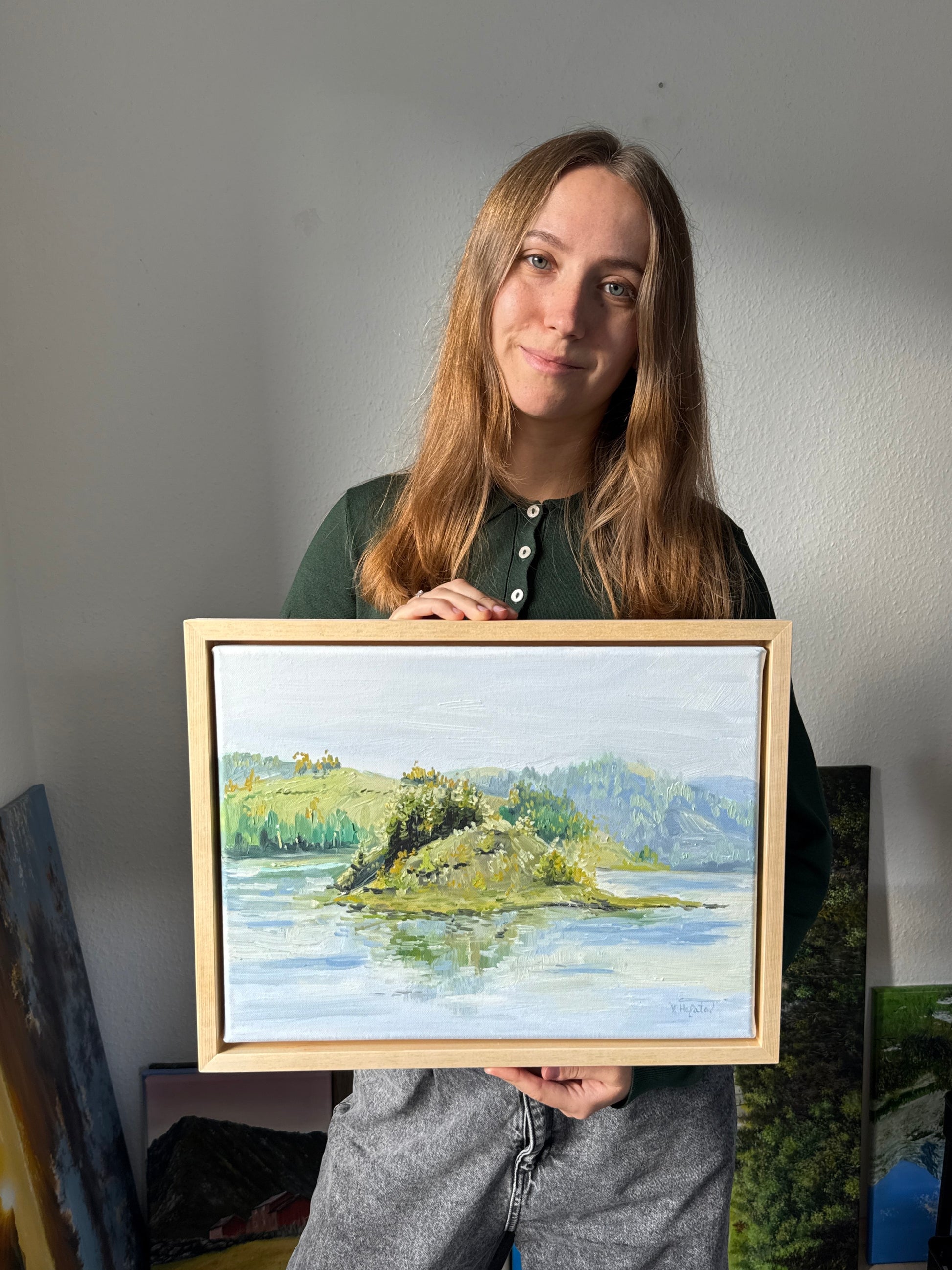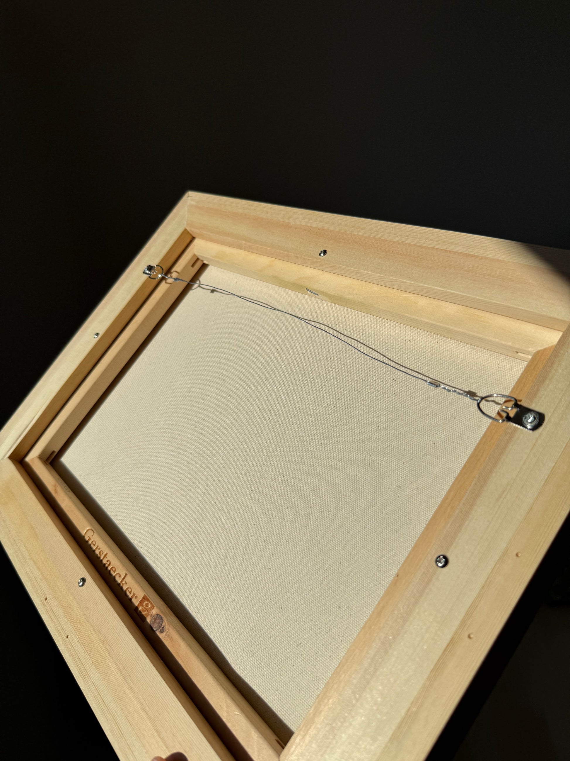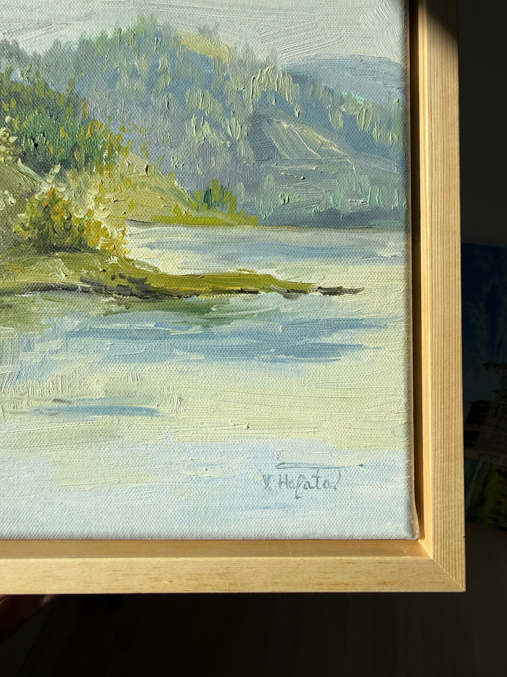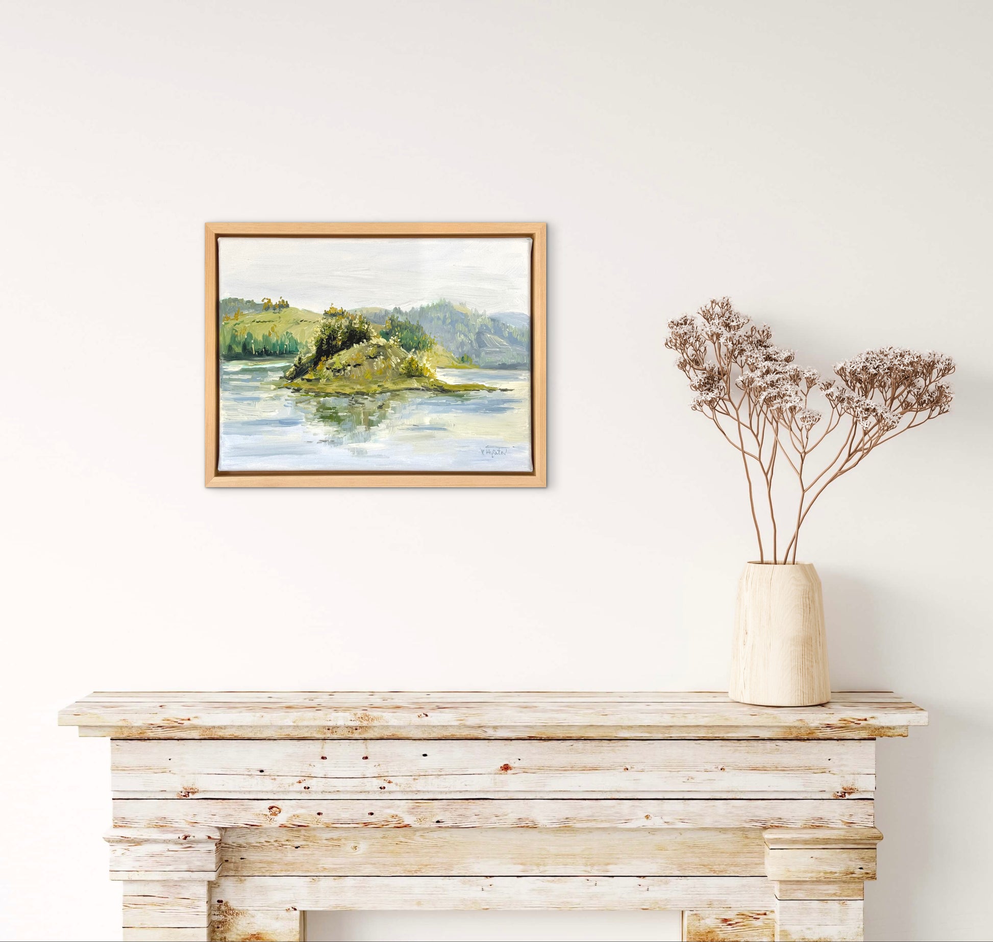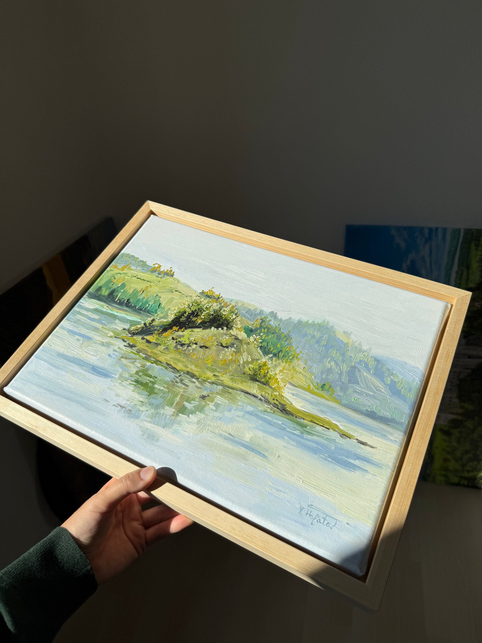 The painting is varnished, mounted in a floating frame and ready to hang.
