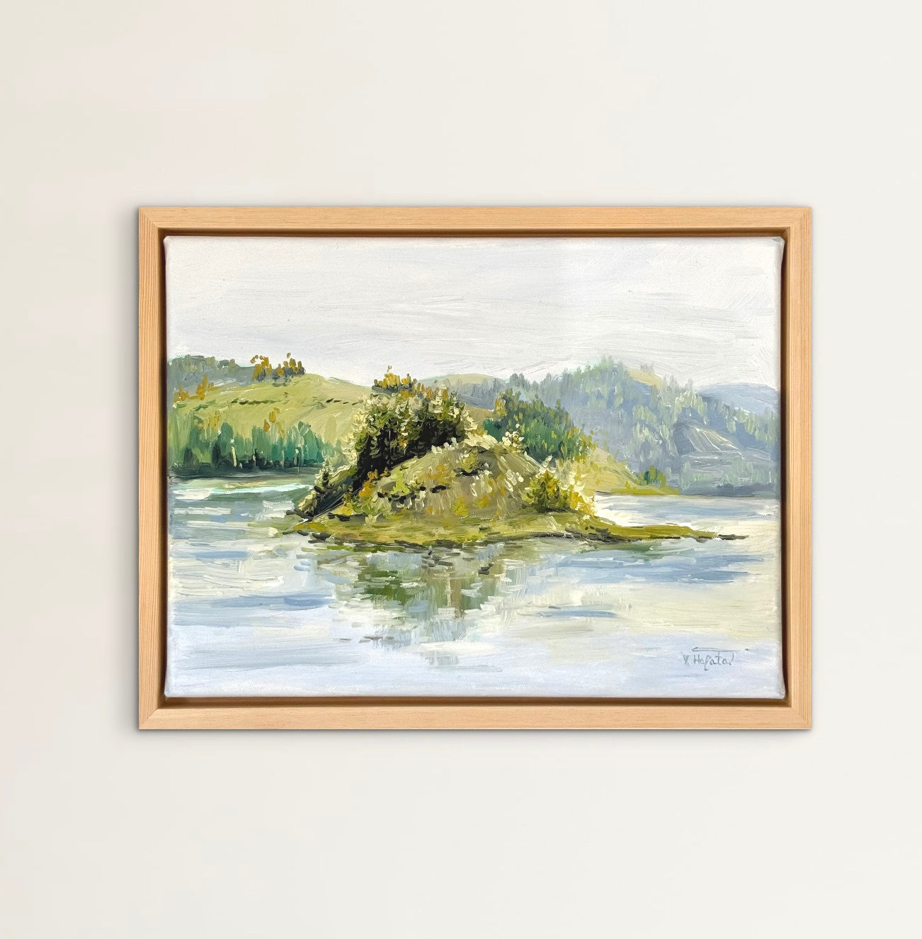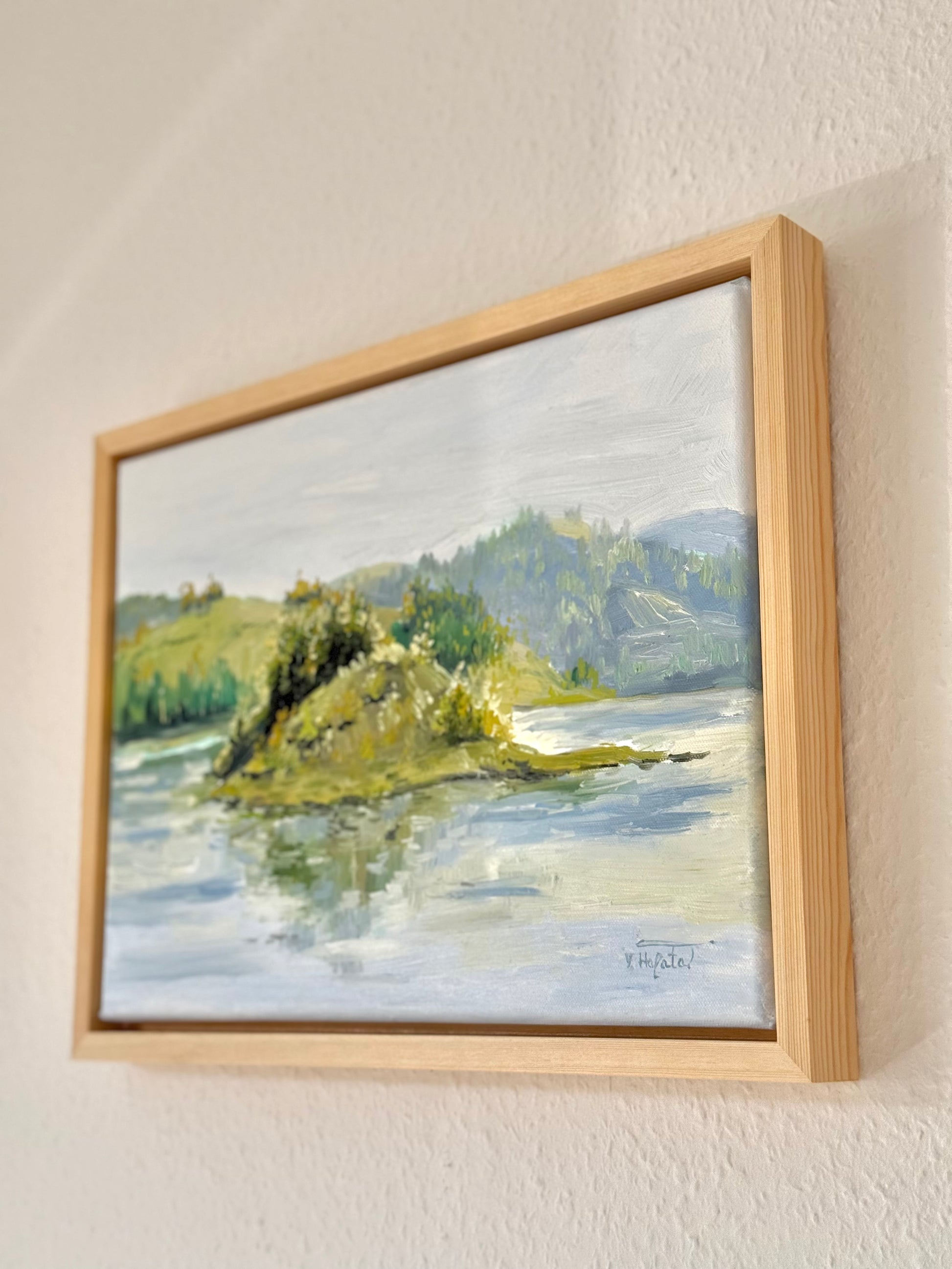 A peaceful vie painting of Vogelinsel, a small island on the Goldisthal reservoir.