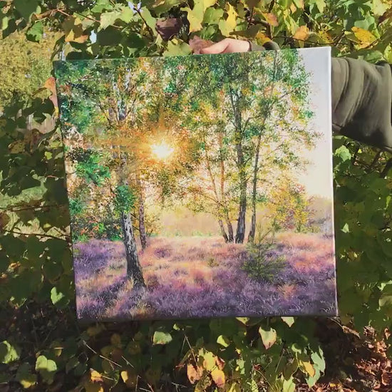 This oil painting depicts the picturesque landscape of the Lüneburger Heide in Germany, where golden sunlight filters through dense tree canopies, illuminating the blooming meadow with a sense of peace and harmony with nature.