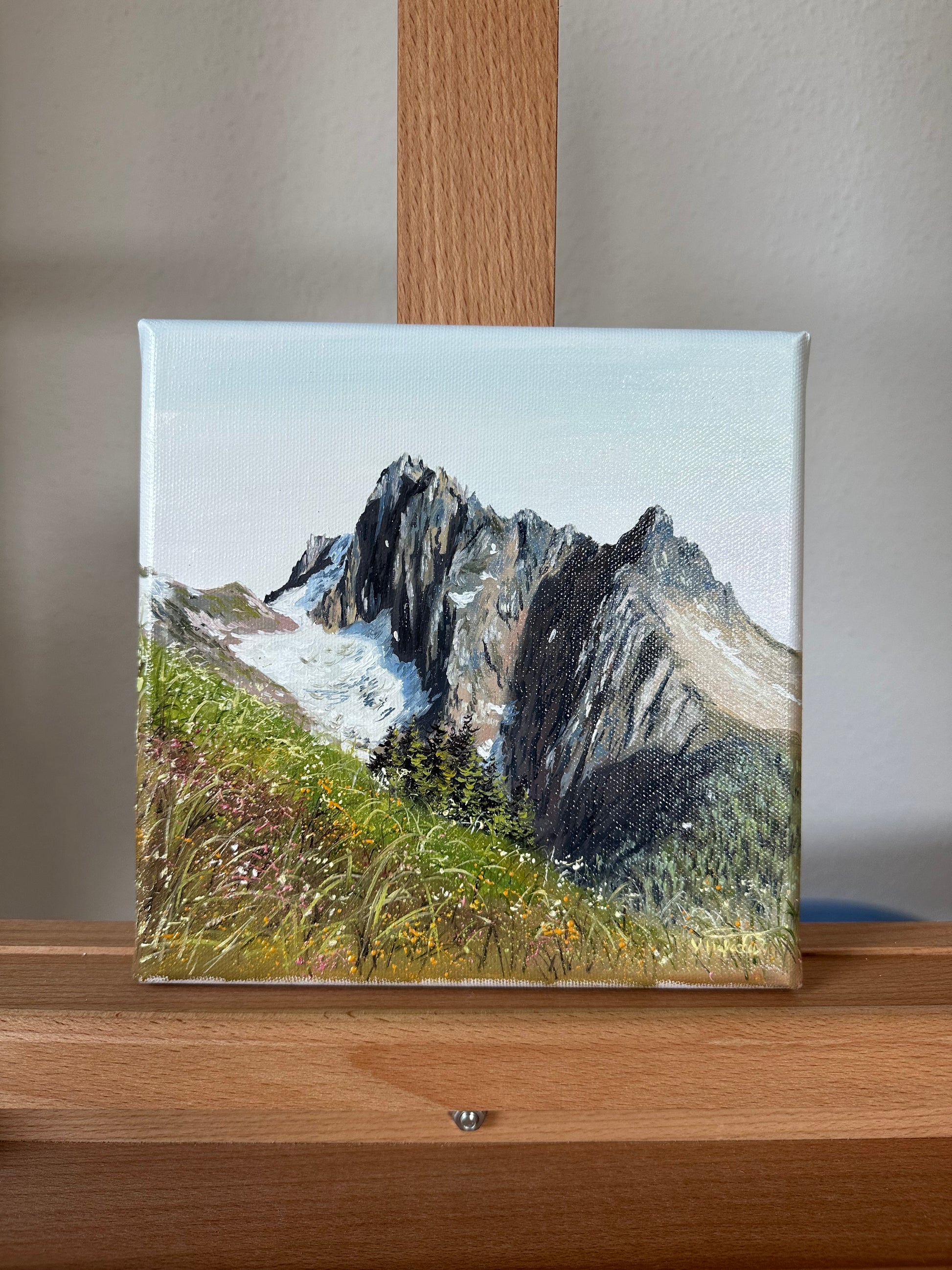 This oil painting portrays the majestic Mount Sefrit rising above a peaceful meadow. This is an original oil painting. A certificate of authenticity is included.